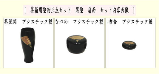 [Tea utensils/tea ceremony tools, tea box and tool set of three] Lacquer three-piece set, black lacquer, fan surface (tea whisk tube, natsume, incense holder), plastic