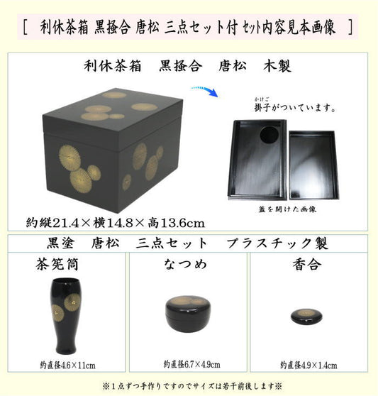[Tea utensils/tea ceremony tools tea box] Rikyu tea box, black kakiawase, Karamatsu, with three-piece set (Kakiawase, Kakiawase, Kakiawase, Kakiawase, Kakiawase, Kakiawase, Kakiawase)