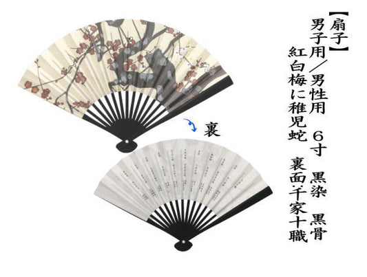 【茶器/茶道具 扇子 干支「巳」】 干支扇子 男子用/男性用 6寸 黒染 黒骨 紅白梅に稚児蛇 裏面:千家十職 (干支巳 御題夢) (干支 巳・蛇)