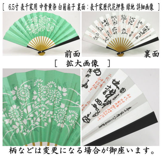 [Tea utensils/tea ceremony tools, folding fan] 6.5 inch Omotesenke yellow-dyed white chrysanthemum folding fan, back: Omotesenke successive generations' signature collection, white or green, choose from two types