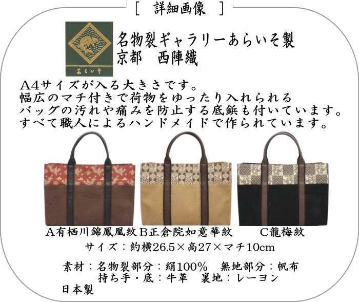 [Daily necessities/miscellaneous goods Tote bag/tote bag] One-point tote bag (R-9) Made of leather handle Arisugawa Nishiki Phoenix crest or Shosoin Nyoika crest or Dragon and plum crest Made by Araiso