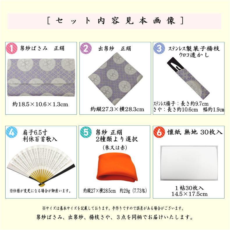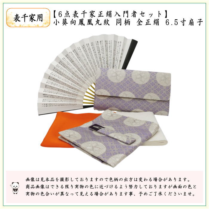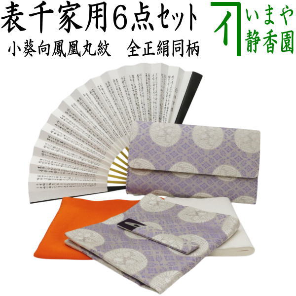 【茶器/茶道具セット 茶道初心者用】 6点表千家正絹入門者セット 小葵向鳳凰丸紋 (全正絹 扇子 6.5寸 利休百首 表千家用)