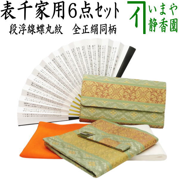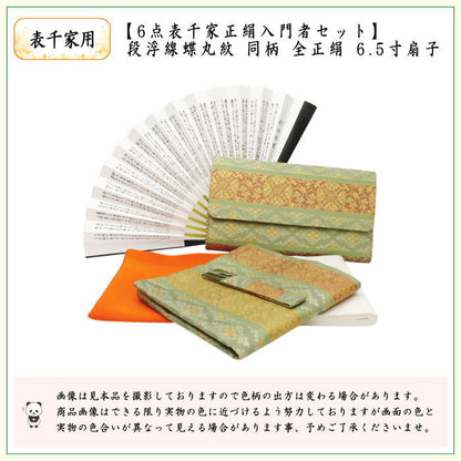 【茶器/茶道具セット 茶道初心者用】 6点表千家正絹入門者セット 段浮線蝶丸紋 (全正絹 扇子 6.5寸 利休百首 表千家用)