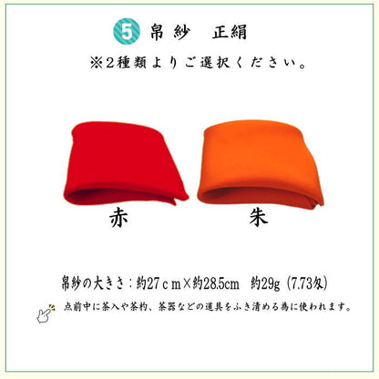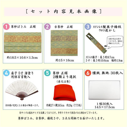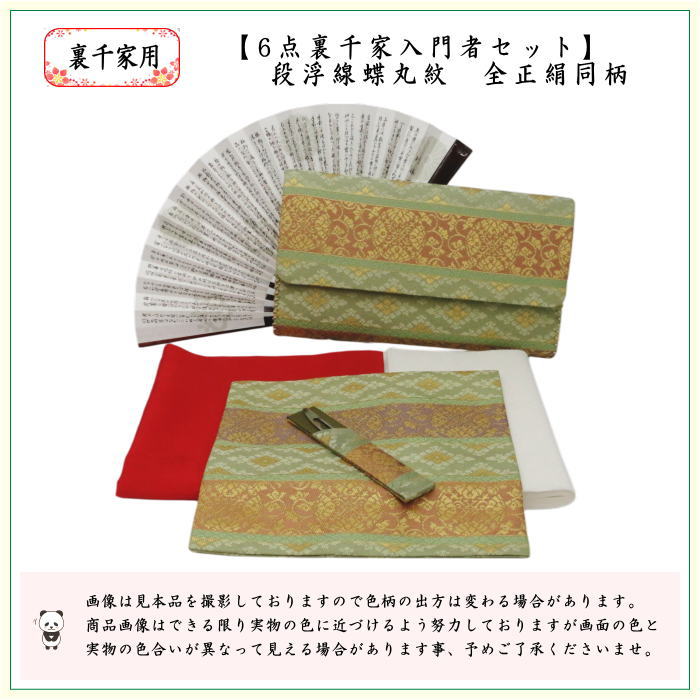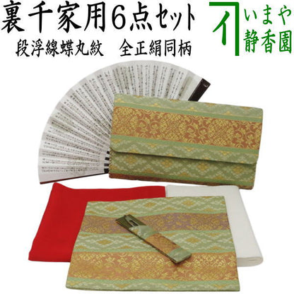 【茶器/茶道具 入門セット 茶道初心者用】 入門者裏千家6点セット 段浮線蝶丸紋 (全正絹 扇子 5寸 溜塗り)