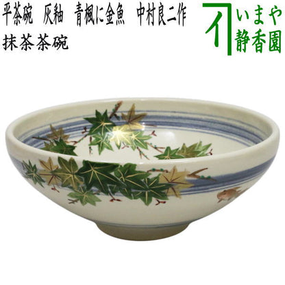【茶器/茶道具 抹茶茶碗/平茶碗】 平茶碗 灰釉 青楓に金魚 中村良二作
