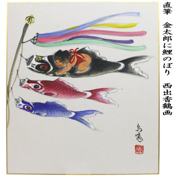 【茶器/茶道具 色紙画賛 端午の節句】 直筆 金太郎に鯉のぼり 西出香鶴画 (鯉登・鯉幟)
