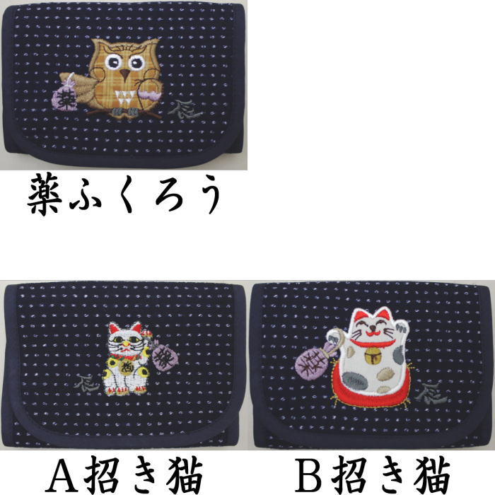 【日用品/雑貨 袋物/小物】 薬入れ(小銭入れ) 久留米絣 薬ふくろう又は招き猫 耽美 鎌谷辰美作 刺繍 日本製