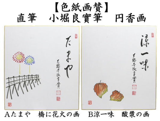 【茶器/茶道具 色紙画賛】 直筆 たまや 橋に花火の画又は涼一味 酸漿の画(ほおずき) 小堀良實筆 円香画